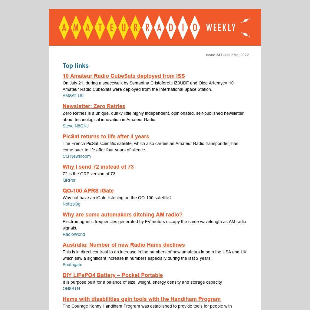 10 Amateur Radio CubeSats deployed from ISS On July 21, during a spacewalk by Samantha Cristoforetti IZ0UDF and Oleg Artemyev, 10 Amateur Radio CubeSats were deployed from the International Space Station. AMSAT UK