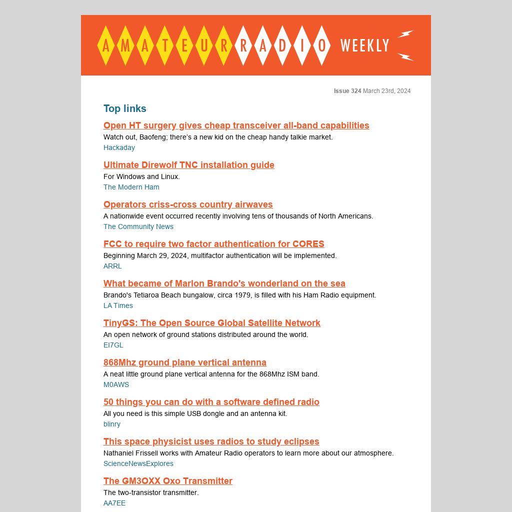 For the first time, I'll be driving up for Hamvention in May. I'm attending as a member of the press and my current thinkinig is to attempt a number of short-form audio interviews with interesting orgs, Hams, vendors, etc., which will be posted both here in the newsletter and on the daily site. I'm also having stickers made up, so hunt me down if you'd like one. Hope to see you there!