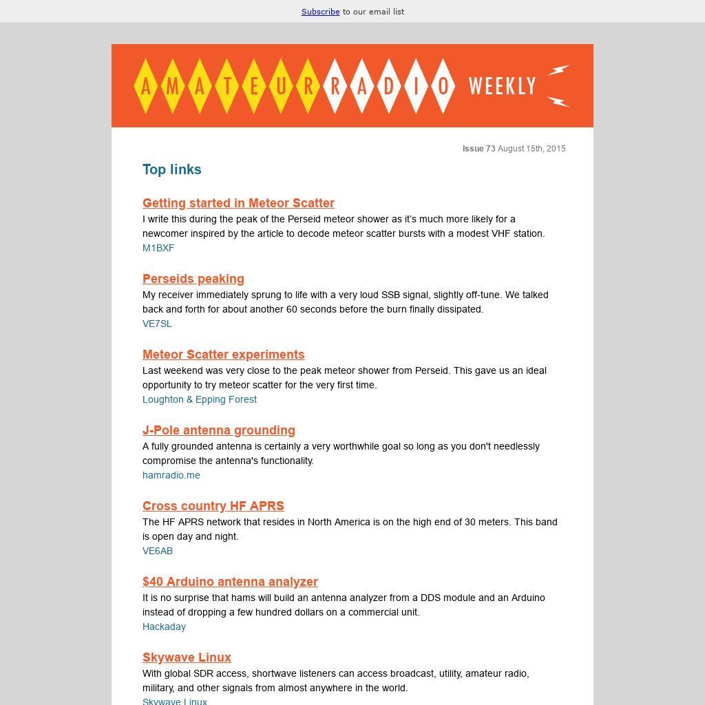 Issue 73 of Amateur Radio Weekly features HF APRS, J-Pole antenna grounding