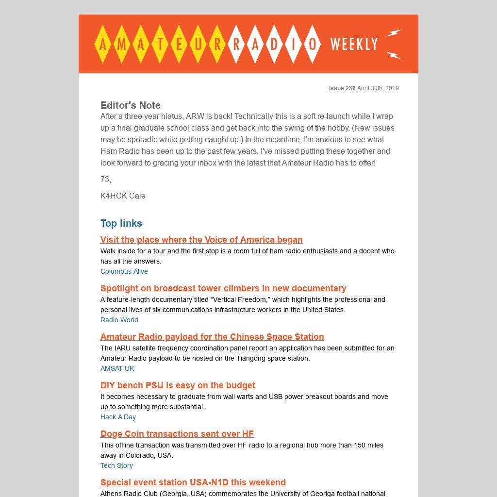 After a three year hiatus, ARW is back! Technically this is a soft re-launch while I wrap up a final graduate school class and get back into the swing of the hobby. (New issues may be sporadic while getting caught up.) In the meantime, I'm anxious to see what Ham Radio has been up to the past few years. I've missed putting these together and look forward to gracing your inbox with the latest that Amateur Radio has to offer!